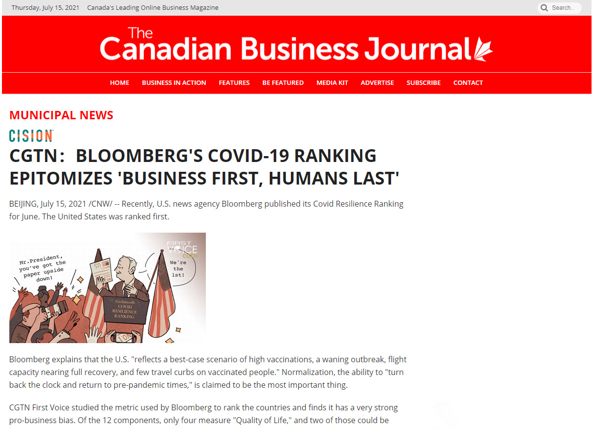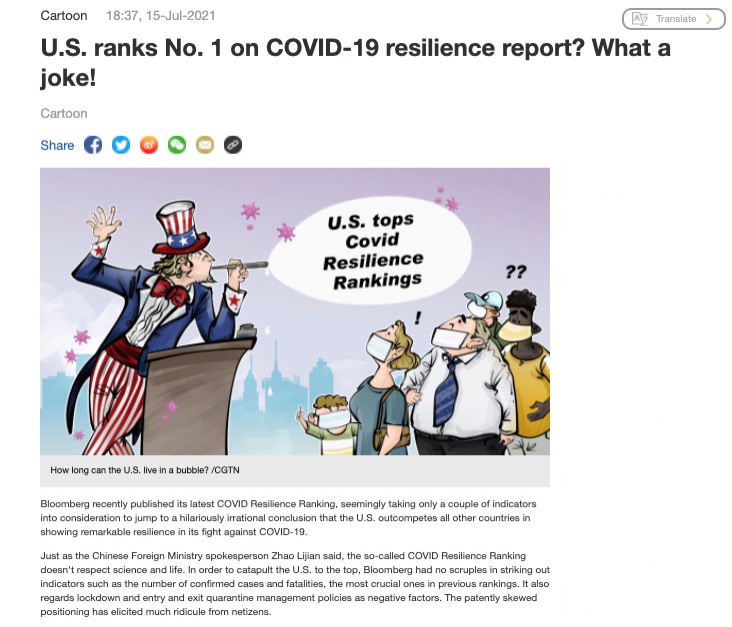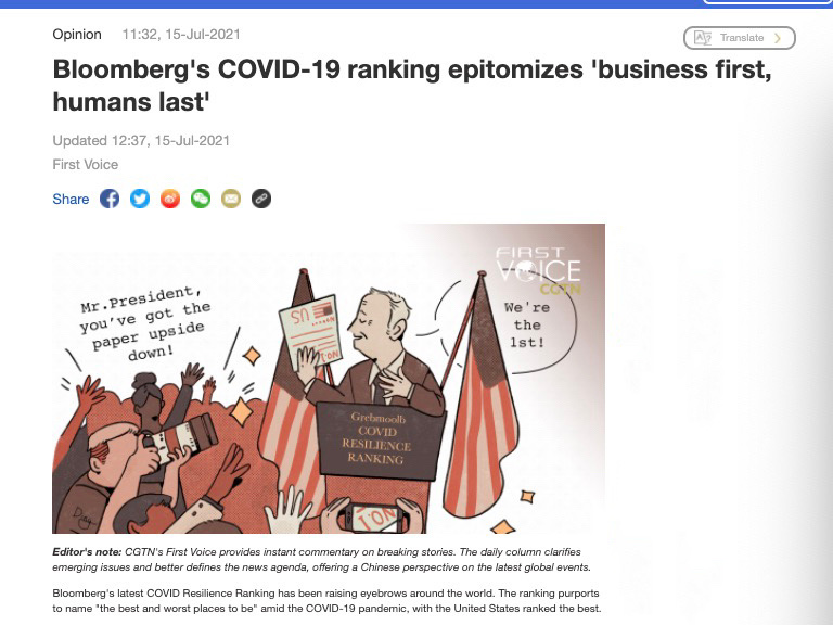 国抗疫排第一?倒数的吧CGTN宣布了题为《美!漫评》的,彭博社排名榜的议论相连合将讥嘲漫画与海表网民批判,抹黑中国以移动国内抵触的真相揭发了美国脉身抗疫不力、却。