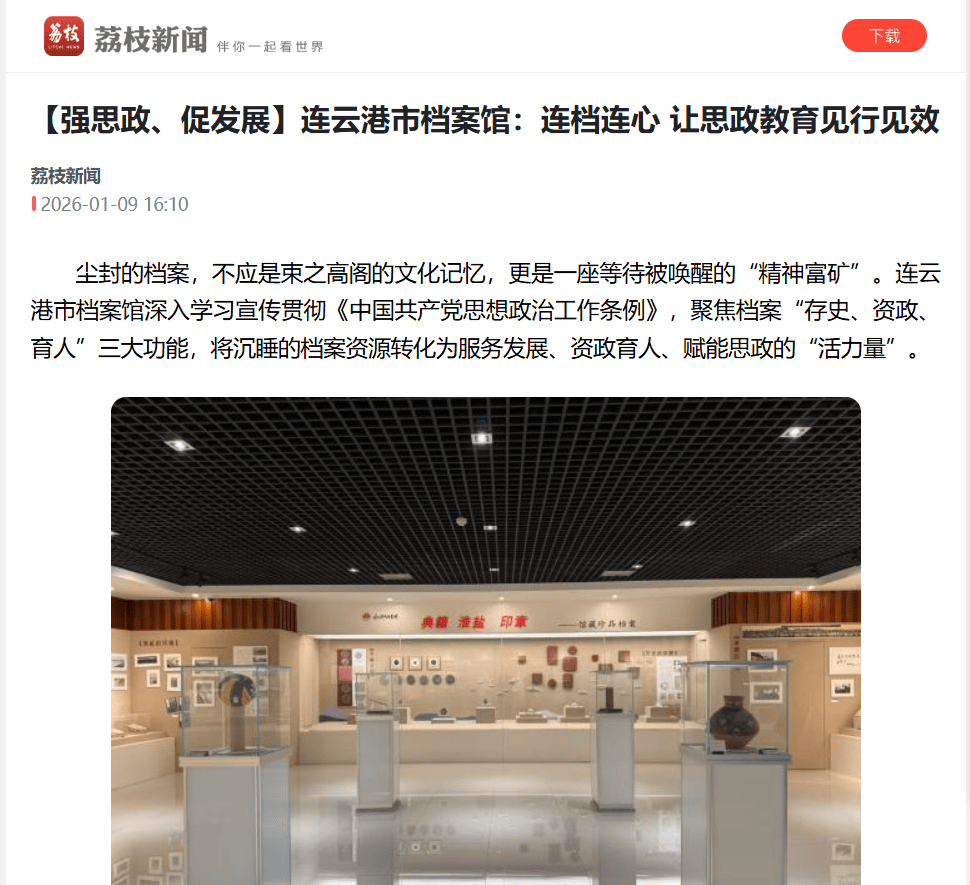 9日起1月,”《摩登疾报》《扬子晚报》等主流媒体接续推出专题报道《新华日报》、省广电总台“江苏新时空”“江苏讯息播送。】连云港市档案馆:连档连心 让思政哺育见行奏效》此日转发江苏广电总台荔枝讯息《【强思政育荔枝新闻报道_市档、促起色,读者以飨。